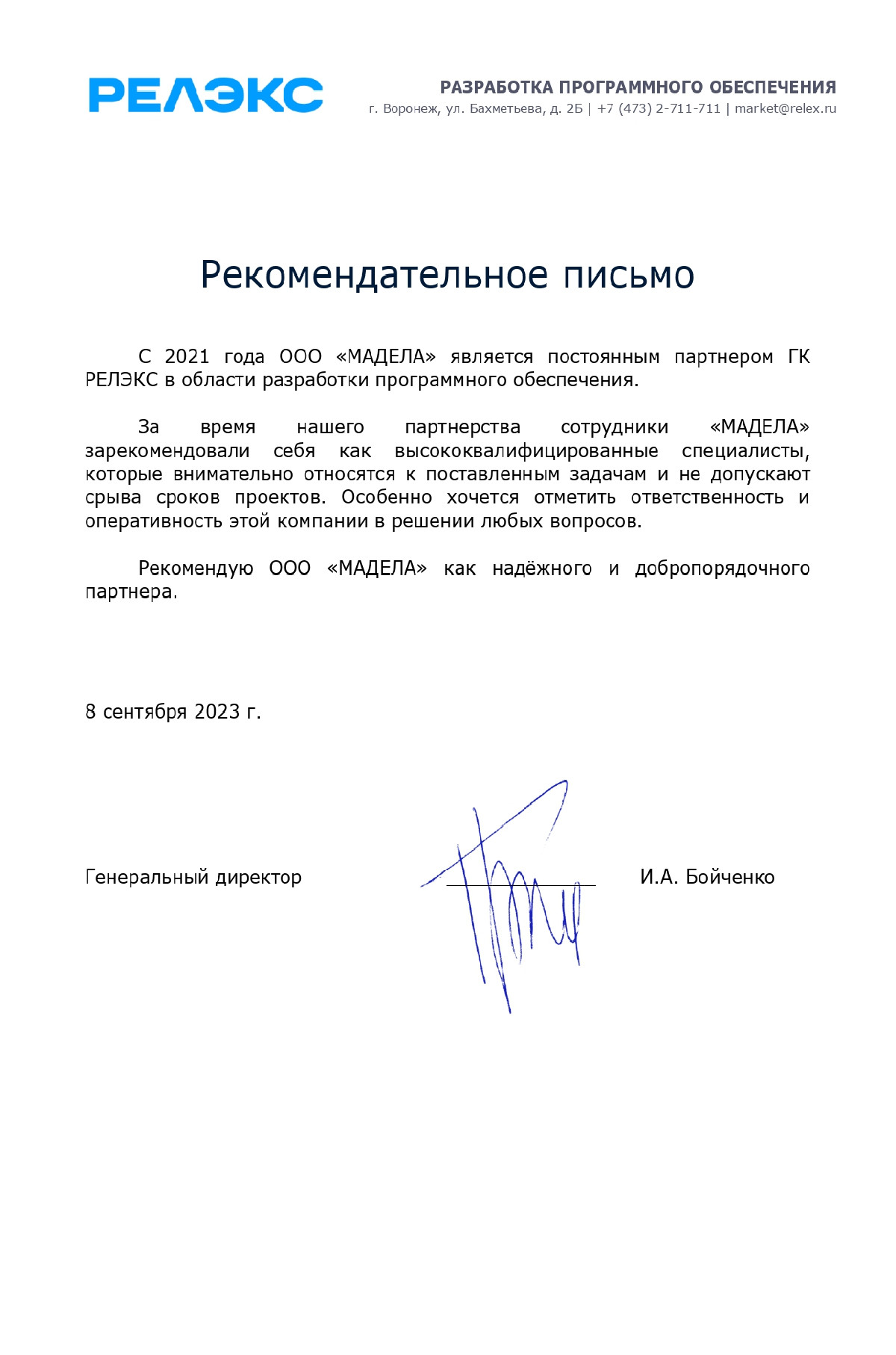За время нашего партнерства сотрудники «МАДЕЛА» зарекомендовали себя как высококвалифицированные специалисты, которые внимательно относятся к поставленным задачам и не допускают срыва сроков проектов. Особенно хочется отметить ответственность и