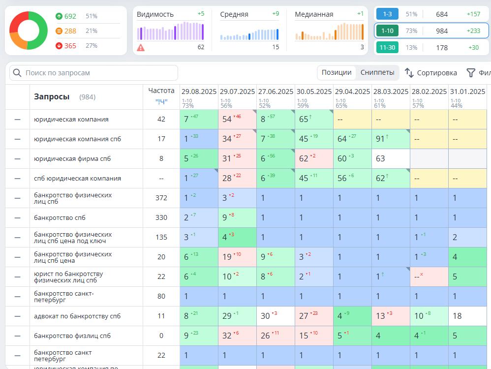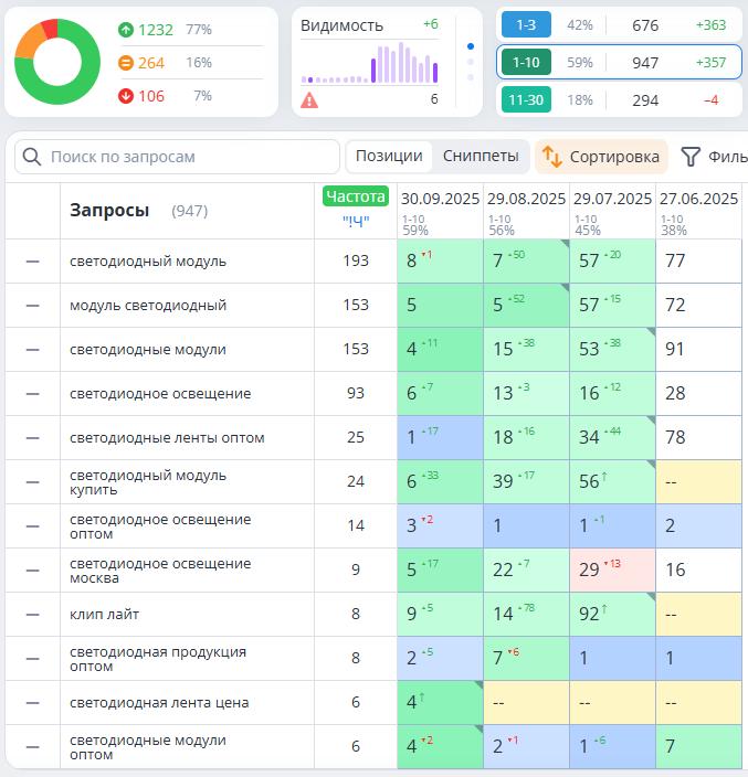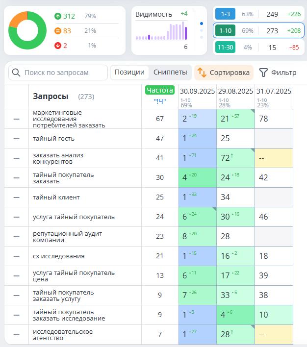 Доля поисковых запросов в ТОП‑10 Яндекса выросла с 23% до 69%, как можно увидеть на скриншоте ниже.