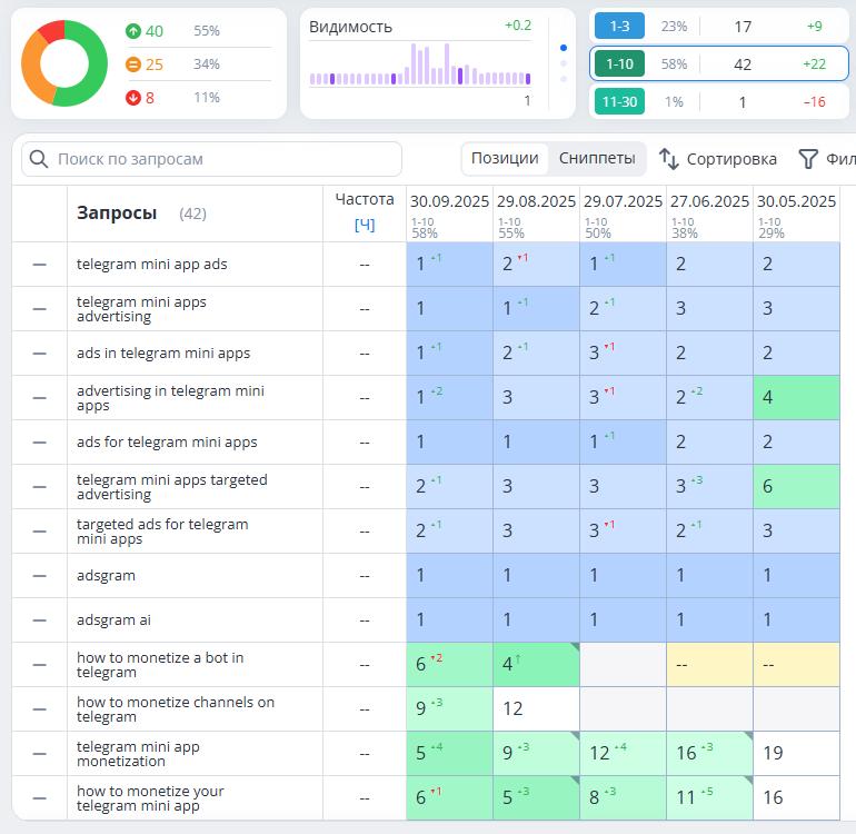Доля запросов в ТОП-10 Яндекса достигла 59%, а в ТОП-3 – 42%.