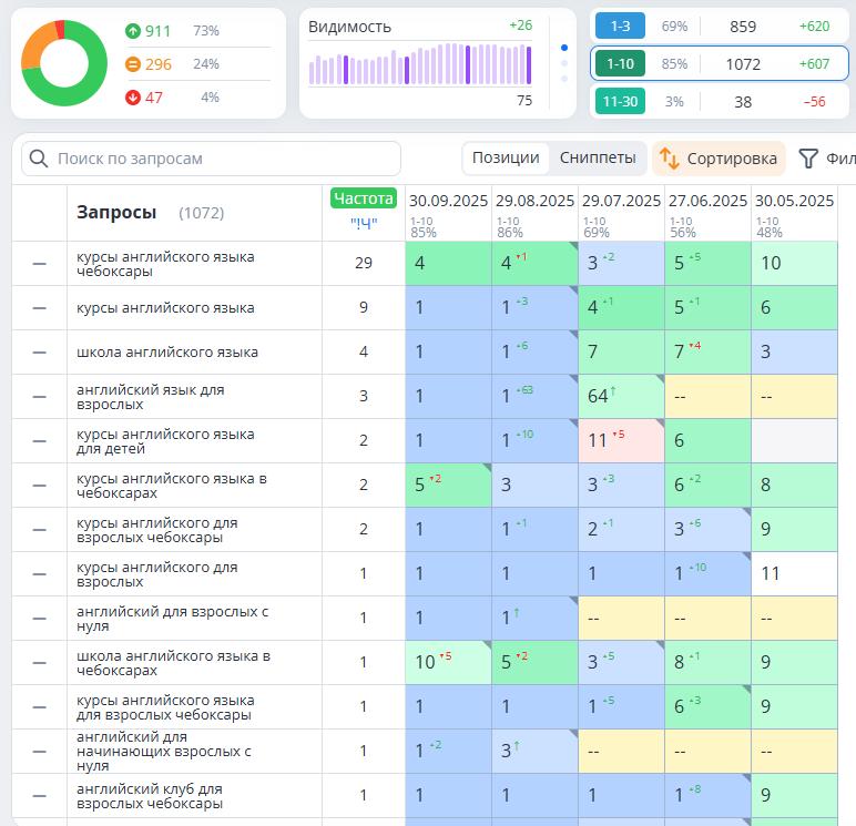 Доля запросов, по которым сайт находится в ТОП‑10 Яндекса, увеличилась с 44% до 73%.