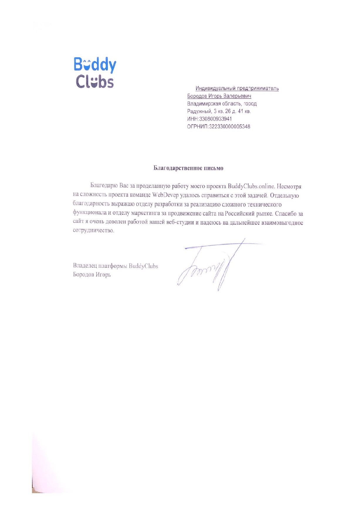 Благодарю Вас за проделанную работу моего проекта BuddyClubs.online. Несмотря на сложность проекта команде WebDevep удалось справиться с этой задачей. Отдельную благодарность выражаю отделу разработки за реализацию сложного технического функционала и отделу маркетинга за продвижение сайта на Российс
