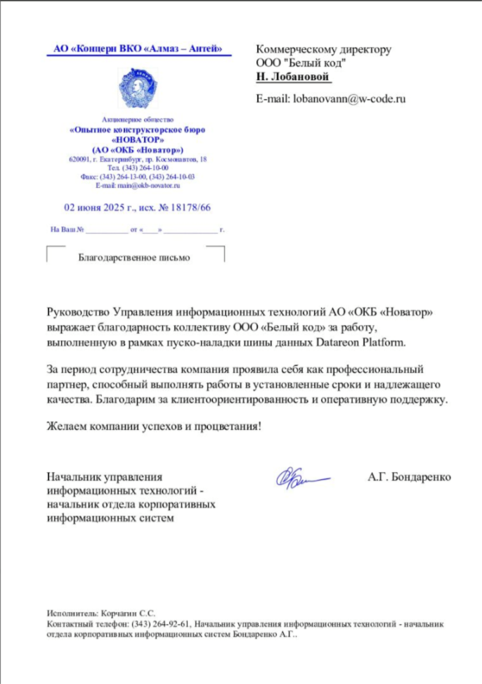 АО «ОКБ «Новатор» выражает благодарность коллективу ООО «Белый код» за работу, выполненную в рамках пуско-наладки шины данных Datareon Platform.