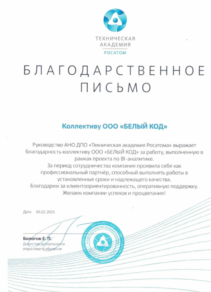 АНО ДПО «Техническая академия Росатома» выражает благодарность коллективу ООО «БЕЛЫЙ КОД» за работу, выполненную в рамках проекта по BI-аналитике.