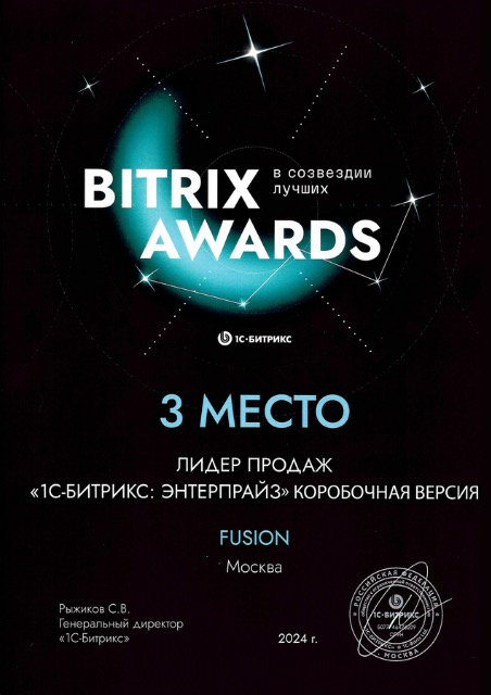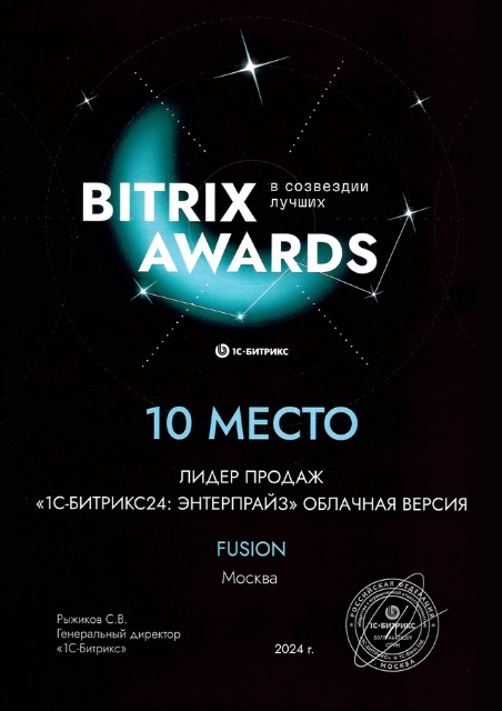 Победа в премии Russian Intranet Awards 2024. 3 место в рейтинге «Лидер продаж „1С-Битрикс24: Энтерпрайс“ коробочная версия».
