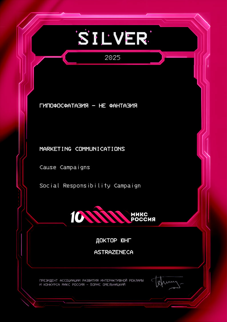 Победили в номинации лучший социальный digital-проект. Наш кейс «Гипофосфатазия — не фантазия» доказал: даже самые сложные темы можно раскрывать через digital так, чтобы это было понятно, близко и трогательно.