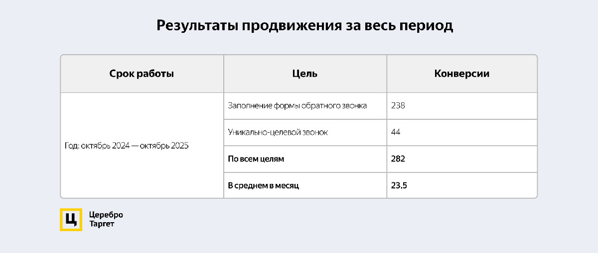 За год продвижения получили 282 заявки по стоимости 2 195 рублей для услуги со стоимостью 33 000 рублей. В среднем 23,5 заявок в месяц. То есть мы нашли рабочие связки для долгосрочной работы, тестировали новые кампании и запустили поток клиентов для начинающего бизнеса. Это именно то, зачем клиника обратилась к специалистам Церебро.