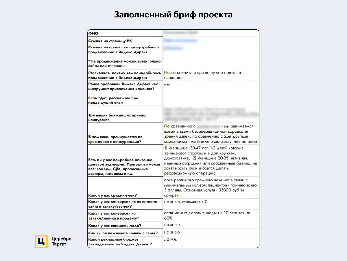 Перед началом работ клиент заполнил обязательный бриф. В нем указал основных конкурентов, описание целевой аудитории, средний чек. Так специалисты получили информацию по проекту из первых рук.