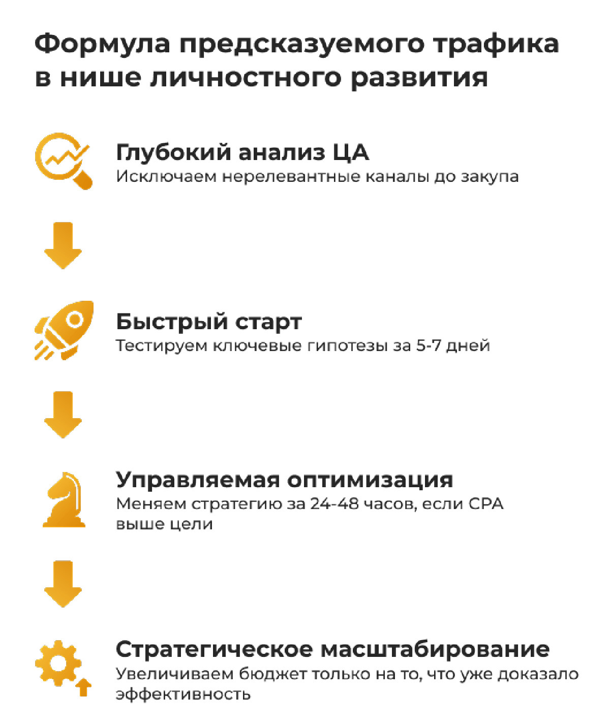 Наш подход работает, потому что:— Мы не закупаем трафик — мы строим мост между экспертом и его идеальной аудиторией.— Мы говорим на языке реальных запросов, а не общих фраз вроде «стань лучше». Такие креативы приводят любопытных, а не тех, кто готов к работе.— Мы не полагаемся на интуицию — она в этой нише часто ведёт к переплатам. Вместо этого мы проверяем всё на данных.— Мы отказываемся от закупа по интересам без анализа — он даёт трафик, но не результат.