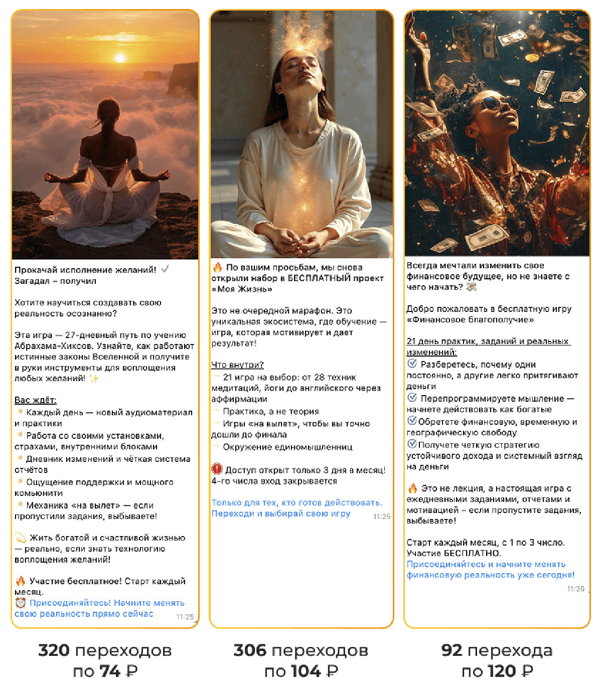 Из 15 рекламных постов оставили только 7 самых сильных: тексты про «духовность» не цепляли, а лучше работали практичные сообщения про изменение мышления и исполнение желаний. Ниши «психология» и "глубинные практики" (таро, гороскопы, работа с мышлением) показали сопоставимые результаты — обе оставили для основного закупа.