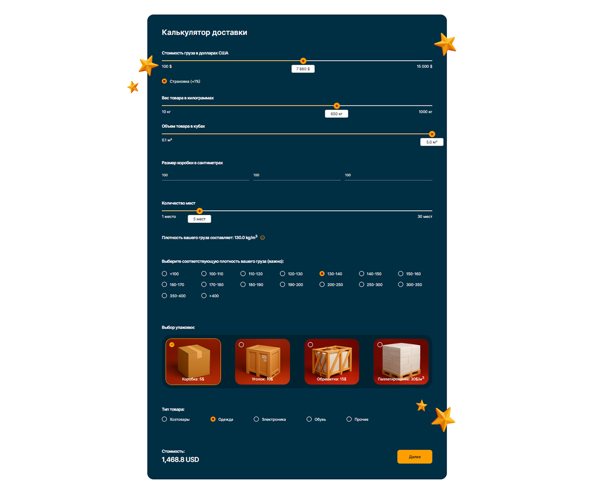 - Логика калькулятора: Разработка алгоритма расчета, учитывающего множество переменных (тип товара, способ доставки, таможенные нюансы) и дающего клиенту достаточно точную и полезную оценку, потребовала глубокого погружения в логистику и нескольких итераций.