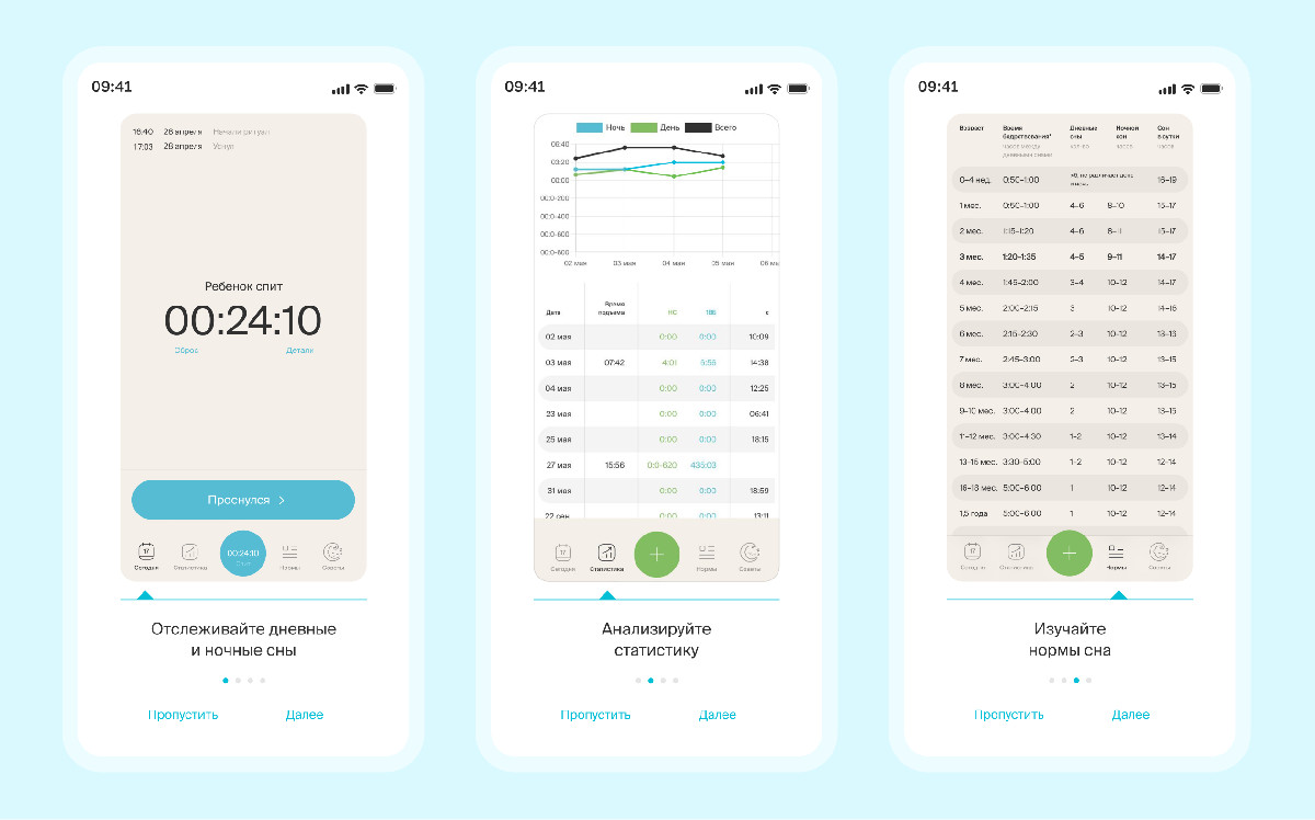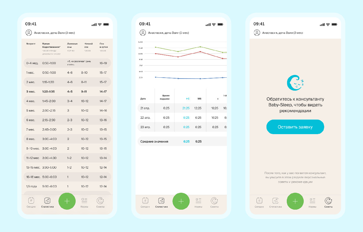 Спроектировали раздел статистики, где история сна собирается в понятный график. Мы продумали логику так, чтобы родитель видел картину дня целиком, а ссылку на отчет можно было отправить консультанту в один клик (без скриншотов).