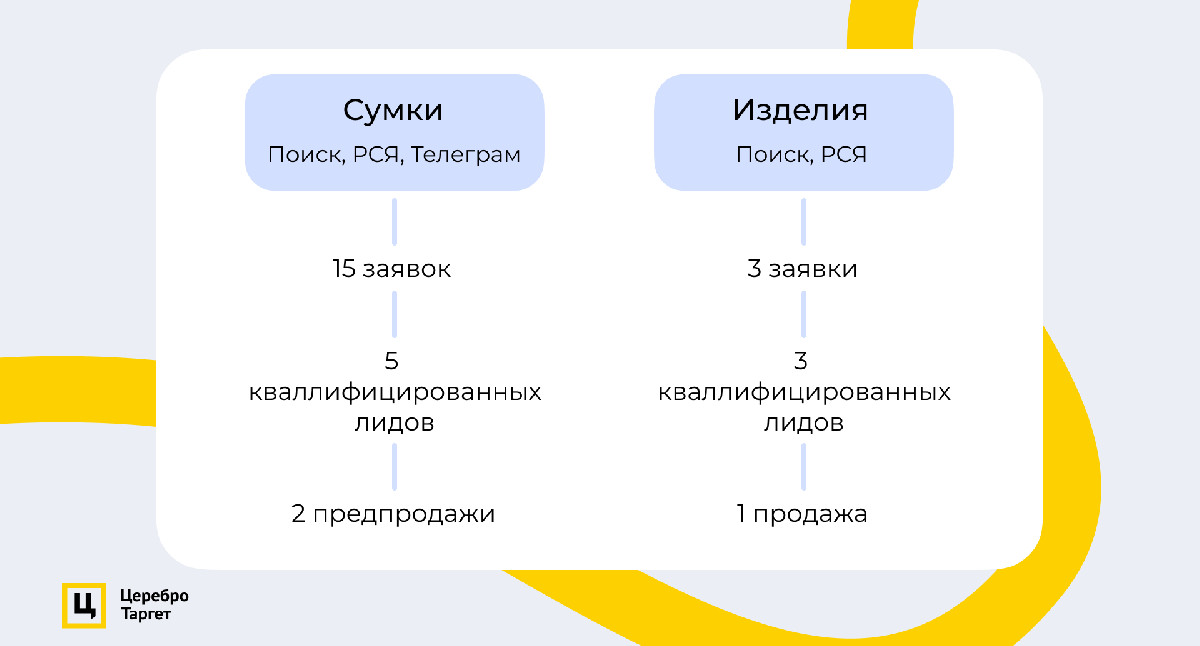 За месяц мы привлекли для премиальных сумок и кожаных изделий 18 заявок, из которых 8 квалифицированных лидов. Также благодаря тестированию бизнес выявил слабое звено в воронке: процесс продаж.