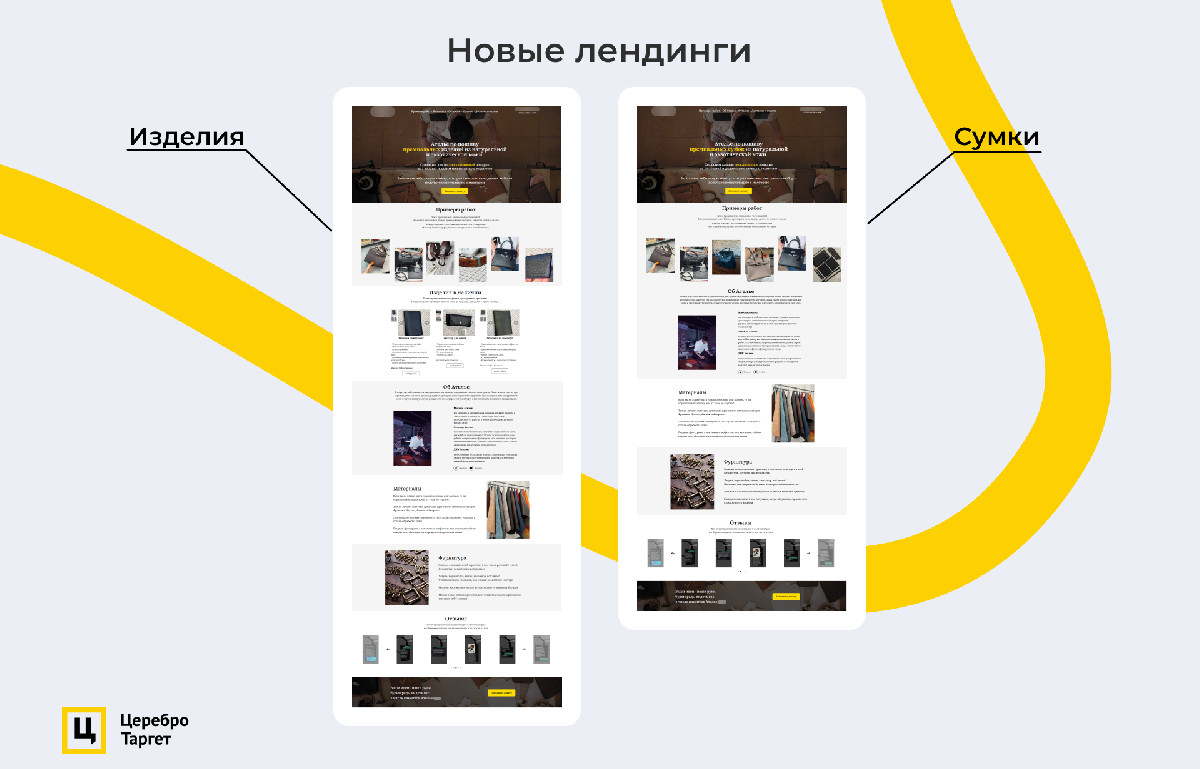 - Создать два лендинга на сумки и изделия, так как у продуктов разная целевая аудитория.