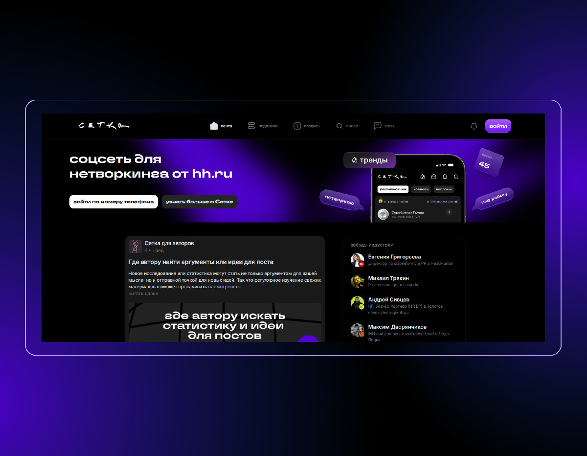 Сетка— это профессиональная социальная сеть для нетворкинга от hh.ru, представленная в мобильном приложении и веб-версии, где можно строить профессиональные связи и открывать новые карьерные возможности.