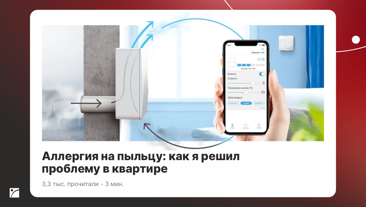 Хорошие результаты получили мы и с нативного материала, нацеленного на аллергиков: «Рециркуляция воздуха в квартире: как я спасся от духоты». В нём мы пошли уже на более узкий сегмент ЦА (аллергиков), но при этом взяли понятный всем посыл — дома душно. Статью прочли 24 000 человек, уделив материалу уже 3,5 минуты вдумчивого чтения.