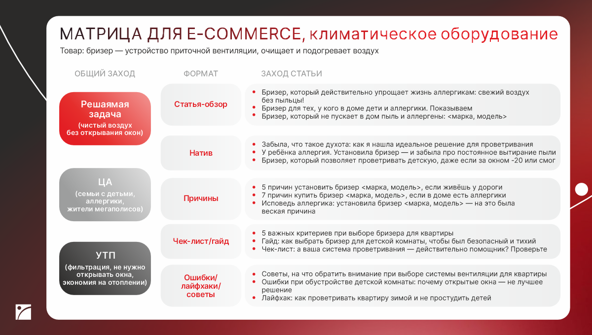 Важно понимать, что бризер — это не импульсивная покупка. Цикл принятия решения может занимать недели и месяцы. Поэтому задача ПромоСтраниц — не столько дать прямые продажи, сколько сформировать знание о продукте, создать интерес и доверие к бренду. Человек, прочитавший статью, запоминает решение и возвращается к покупке позже, когда созреет потребность.