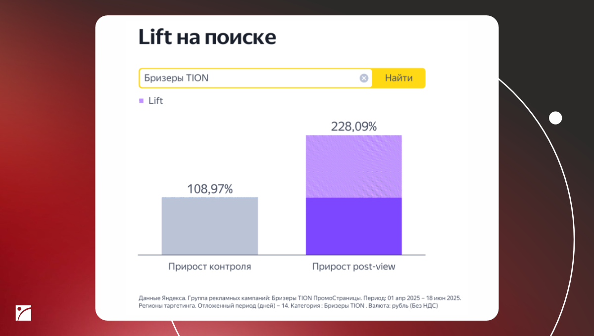Ключевой результат подтверждает отчёт «Лифт на поиске»: аудитория, прочитавшая статьи о ТИОН в ПромоСтраницах, искала бренд в Яндексе на 228,9% чаще, чем те, кто статей не читал. Контрольная группа показала рост всего на 108,97%.