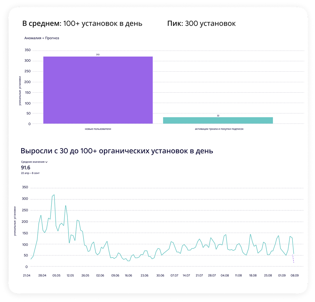 - Нарастили органические установки с ~30 до 100 в день (пик — до 300 инсталлов). В месяц приложение получает до 2 500+ установок.