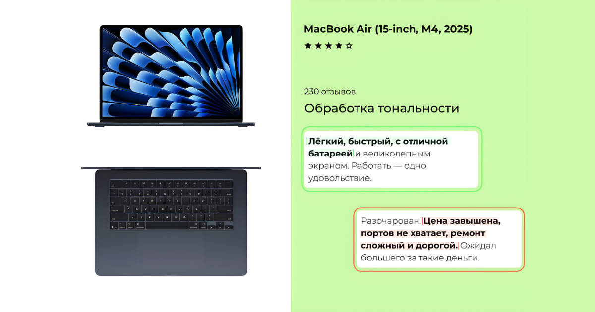 Модель определяет позитивную, негативную или нейтральную тональность по каждому аспекту отдельно и отмечает, каких тем отзыв не касается. Такой анализ позволяет бизнесу видеть не просто «общий NPS», а конкретно понимать, что людям нравится, что раздражает и какие зоны остаются неосвещёнными — независимо от продукта или услуги.