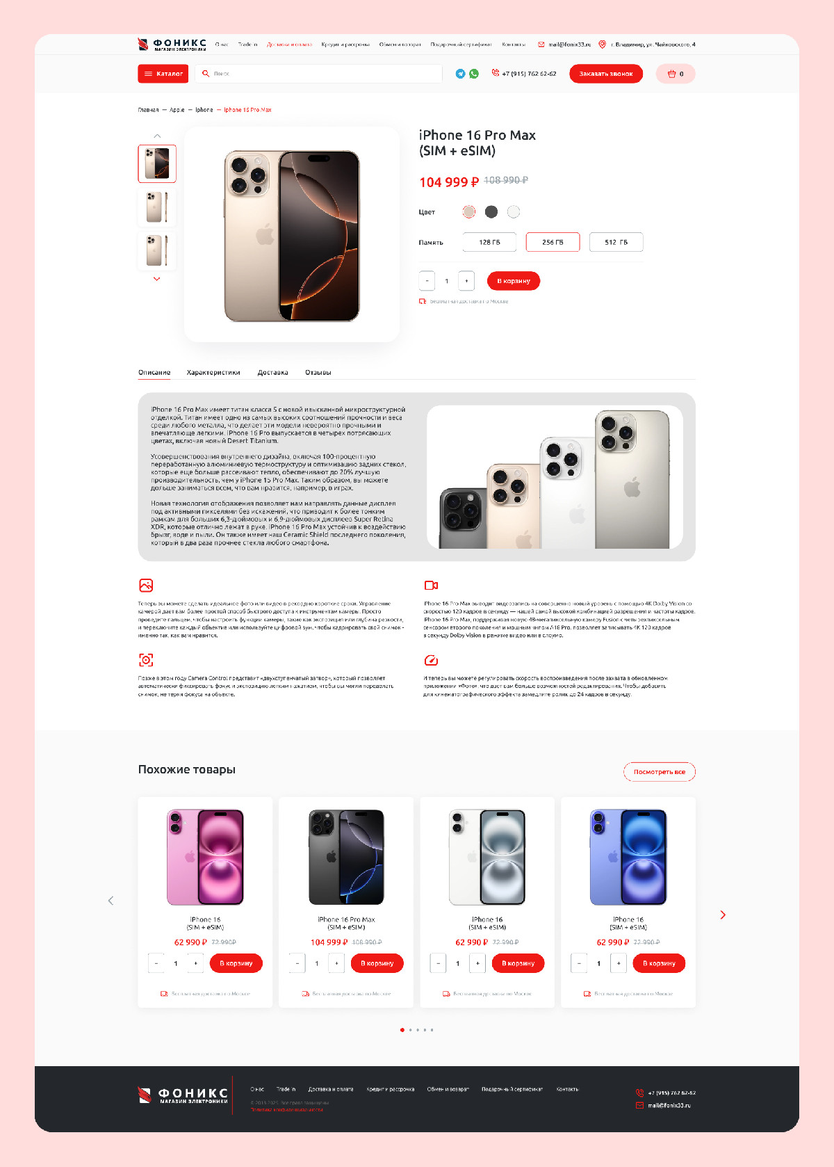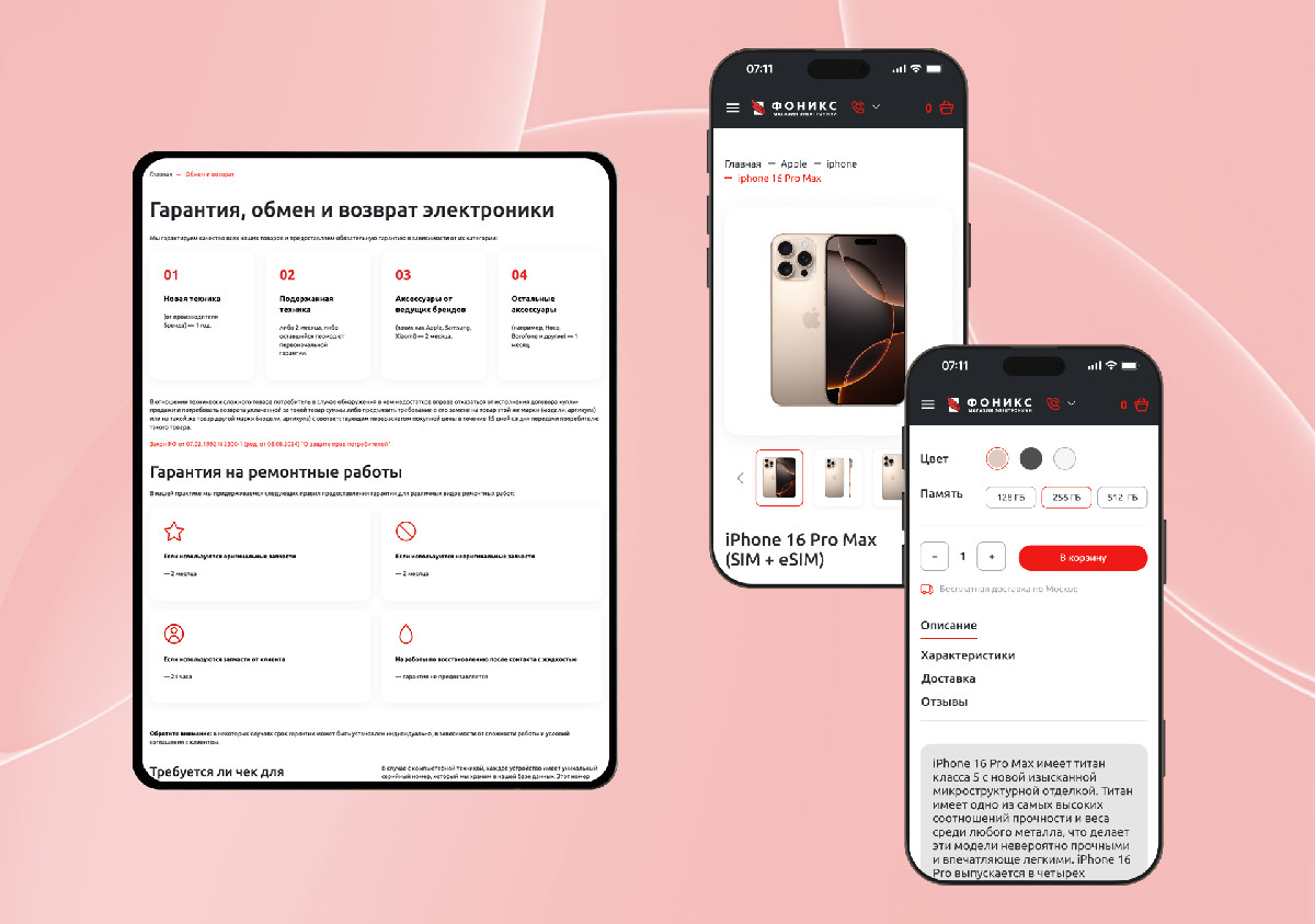 - доработали блоки по пожеланию клиента, как на главной, так и на внутренних страницах. Не ограничились типовыми улучшениями, а тонко настроили ключевые блоки сайта в соответствии с запросами и инсайтами заказчика. В процессе работы клиент поделился экспертным видением и знаниями о своей аудитории, и мы внесли правки в структуру и содержание отдельных секций – как на главной странице, так и на внутренних. Ценность такого подхода в том, что сайт адаптирован под конкретный бизнес: учтены нюансы ассортимента «Фоникса», акценты бренда, привычки именно их покупателей.