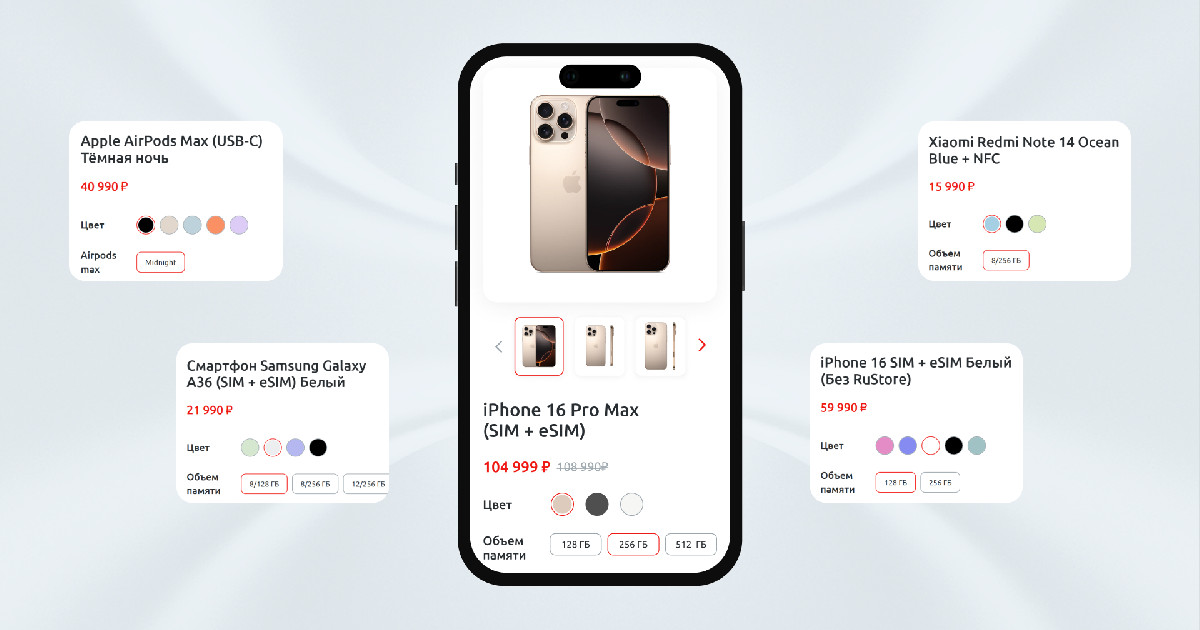 Карточки товара – особенная часть проекта. Если вы когда-то работали в e-commerce, то знаете, как это может быть: один и тот же смартфон в разных цветах и с разными объёмами памяти – и вот уже 12 карточек, которые ничем не отличаются кроме пары цифр. Мы сразу решили: так быть не должно. И сделали по-другому. В одну родительскую карточку встроили все вариации. Покупатель выбирает новый цвет – и интерфейс сам обновляется: цена, наличие, изображение. Всё на одной странице.