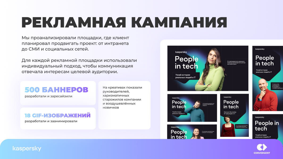 Агентство Convergent разработало интерактивный HR-спецпроект для «Лаборатории Касперского»: лендинг с 16 ИТ-стереотипами, которые опровергают реальные сотрудники компании. Полный цикл: креативная концепция, копирайтинг, фотопродакшен, дизайн, 500+ рекламных баннеров.