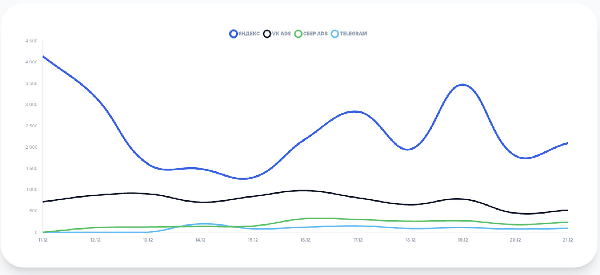 Основные всплески связаны с обновлением креативов и предновогодним спросом.