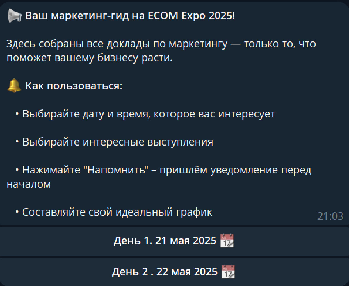 Помимо рассказов о своих успехах и статей с нашими экспертами, подписчикам бота предоставляли полезный контент, связанный с выставкой. Гости могли подписаться на уведомления о секциях, которые их интересовали. За 15 минут «до» им приходило уведомление с темой и местом проведения выступления. Это упрощало навигацию в большом комплексе, позволяло иметь под рукой всю программу. И, конечно же, стимулировало пользоваться ботом!