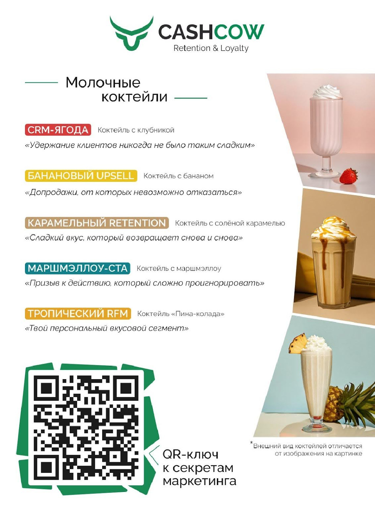 Мы подготовили меню с бесплатными молочными коктейлями. Для каждого придумали оригинальное название с отсылками к СРМ-маркетингу. Для вкусов описали преимущества направления: «удержание клиентов», «допродажи», «возвращение покупателей», «персонализация». Так мы нативно погружали потенциальных клиентов в нашу сферу.