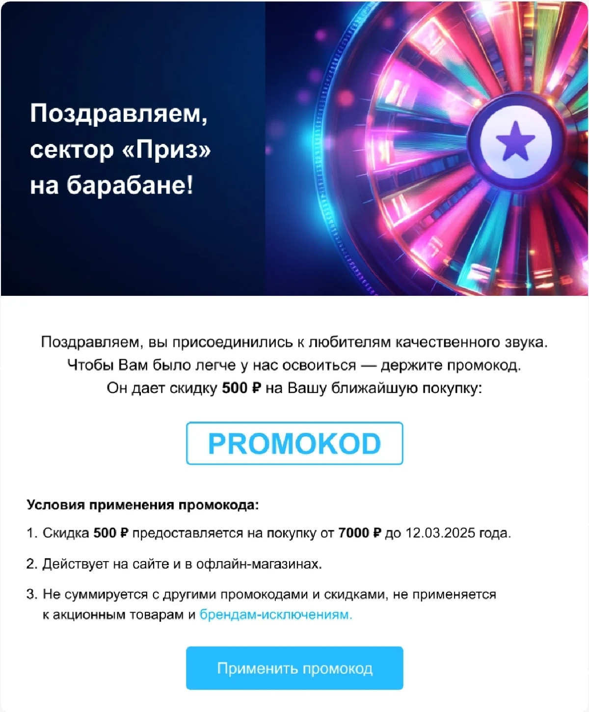 По итогам нашего эксперимента самыми востребованными оказались промокоды на 500 и 1000 рублей. Также для нас стало открытием, что в среднем получателям скидки нужно 1,5 месяца, чтобы дойти до следующей покупки. Это хороший показатель для магазина аудиотехники.
