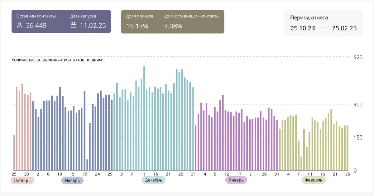 Ровно за 4 месяца работы виджета «Колесо фортуны» мы собрали 36 449 контактов. В среднем это по 293 почты в день. Как и у большинства бизнесов, на трафик сайта клиента и активность покупателей влияет ярко выраженная сезонность. Ее пик приходится на зиму, после чего происходит спад. С учетом этой особенности механика демонстрирует хорошие результаты до сих пор.