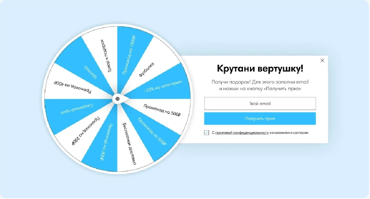 Механика представляет собой всплывающее окно во время сеанса на сайте. Посетителю предлагается поучаствовать в розыгрыше, прокрутив барабан. Для этого нужно оставить свою почту и нажать на кнопку «Получить приз». Тогда колесо начинает вращаться, а на оставленный адрес электронной почты (email) посетителю приходит промокод на выпавший подарок.