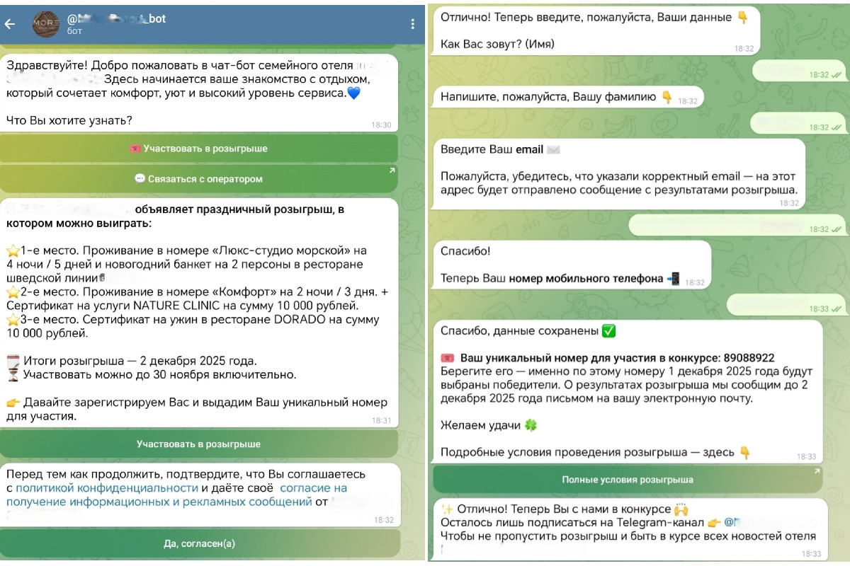 Для розыгрыша был продуман и разработан чат-бот. Подписчиков Telegram-канала СПА-отеля мы вели в него. Также запустили бизнес-аккаунт в Telegram, чтобы получить ещё больше участников конкурса. Коммуникация в боте была простой, без лишних сообщений. Мы запрашивали контакты, согласие на рассылки и отправляли номер для розыгрыша.