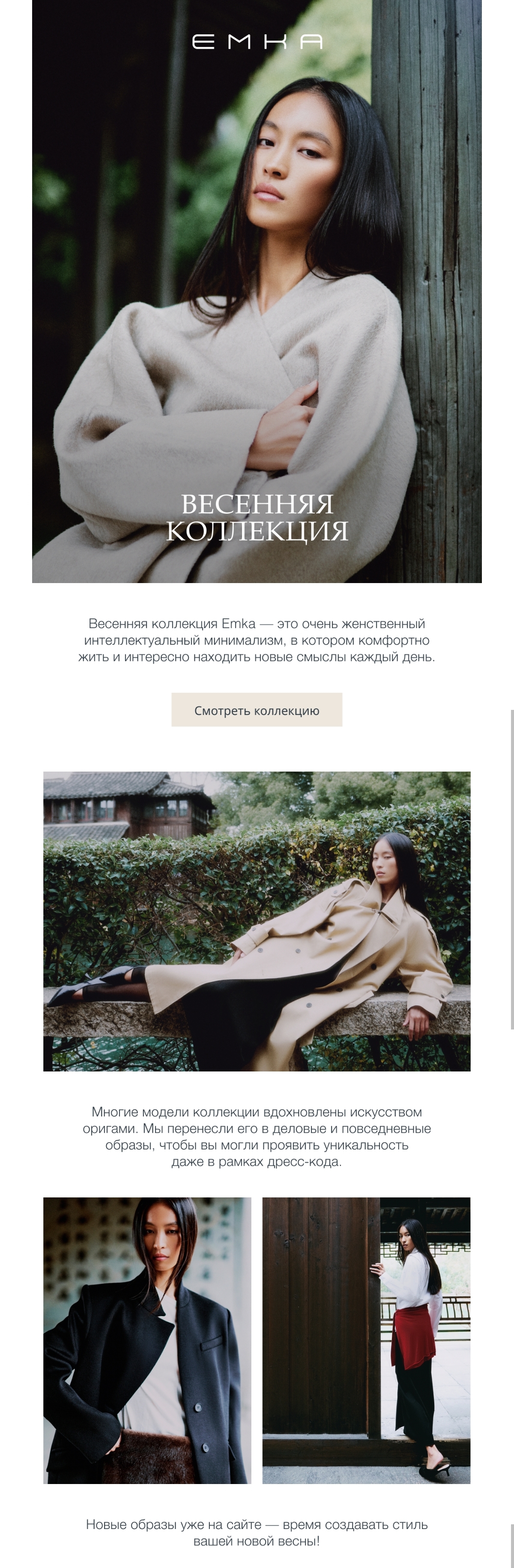 Emka — российский производитель женской одежды, который работает с 2002 года. Бренд специализируется на стильных, деловых и повседневных образах. У компании собственное производство в Калужской области, при изготовлении используется высокотехнологичное испанское и немецкое оборудование. Emka делает упор на капсульность гардероба, уделяя особое внимание качеству и безупречной посадке одежды. Развивает розничную сеть (26 магазинов), активно работает с оптовыми покупателями (более 400 партнеров) и маркетплейсами.