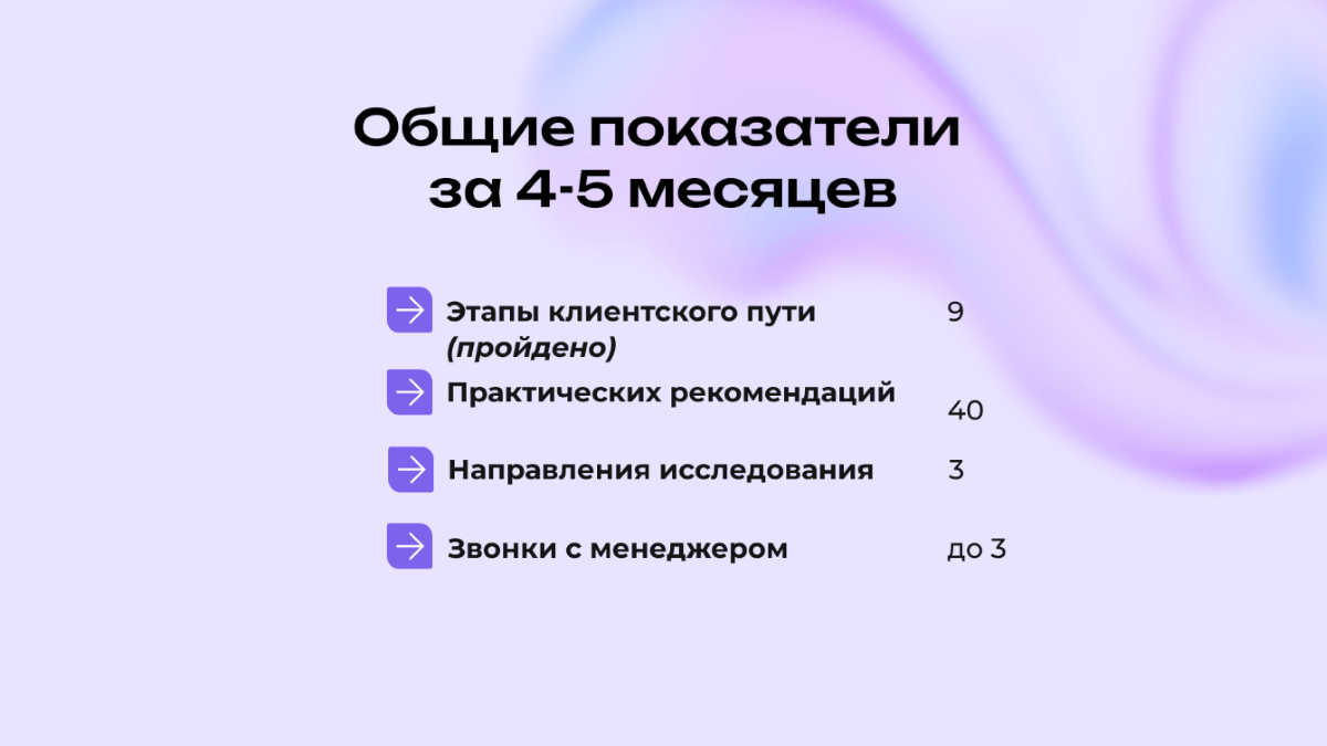 Главный результат — 40 практических рекомендаций по продукту, маркетингу и клиентскому пути. Материалы переданы продуктовой, маркетинговой и аналитической командам клиента и взяты в работу.