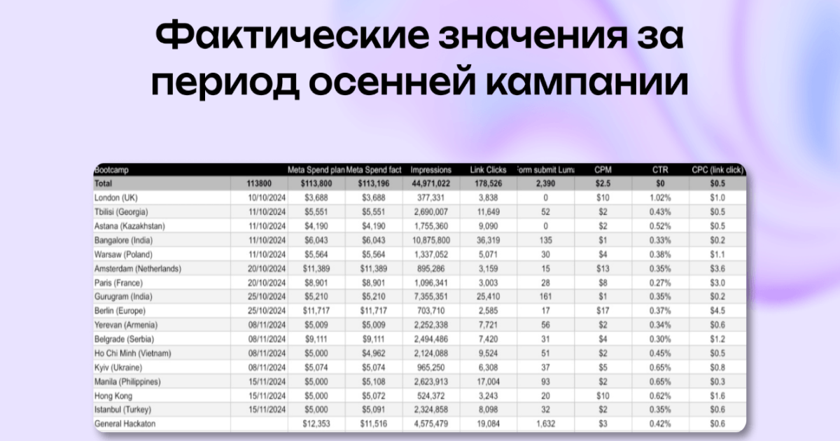 Мы за 4 дня собрали воронку для Web3-хакатона без пикселей и с лимитом $50/день. Привлекли 4 425 лидов по €2.70, масштабировали кампанию на 15+ стран и обеспечили стабильный поток участников через Telegram-прогрев.