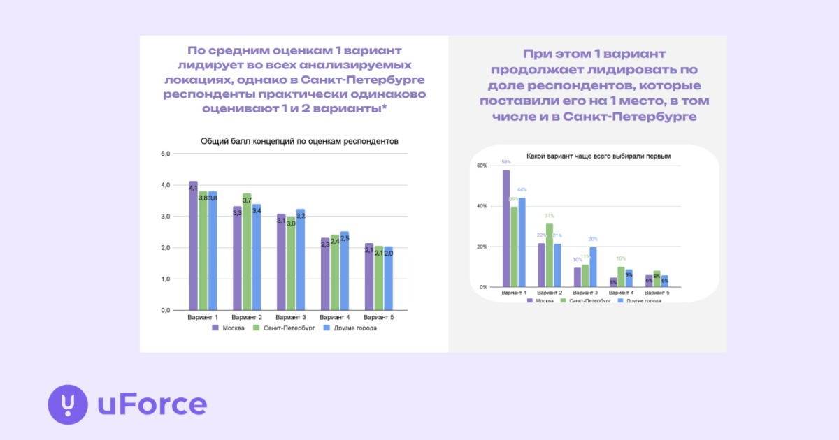 Один макет вышел в лидеры во всех сегментах — результат не зависел ни от пола, ни от географии респондентов. Это дало клиенту однозначный ответ без необходимости взвешивать компромиссы между группами. Дополнительно собрали комментарии с аргументацией выбора — это дало качественный слой поверх цифр.