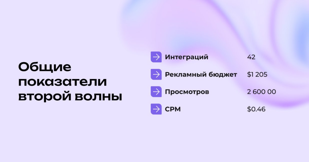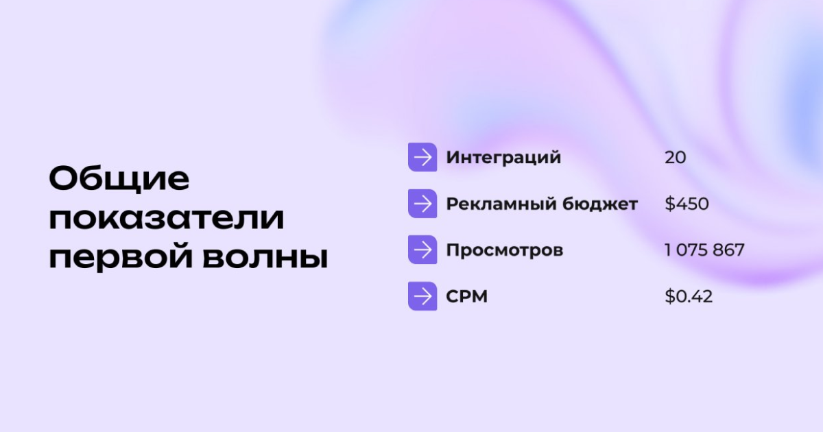Первая волна из 20 интеграций превысила плановые показатели по просмотрам в четыре раза — при этом значительная часть охвата пришла бесплатно через YouTube Shorts. CPM оказался существенно ниже рыночного.Во второй волне масштабировали количество интеграций до 42. Результат снова превзошёл план — на этот раз более чем в три раза. Бесплатный охват с YouTube добавил ещё миллион просмотров сверху.По итогам двух волн совокупный охват составил более 4 миллионов просмотров.