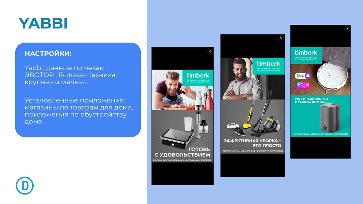 Использование данных транзакций по чекам ЭВОТОР, а также таргетинг на пользователей, на чьих смартфонах установлены релевантные приложения, позволило нам точно выделить аудиторию, интересующуюся товарами для дома.