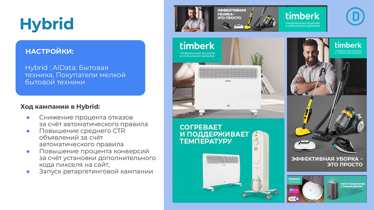 Помимо предиктивных настроек на сегменты пользователей, мы использовали автоматические правила для снижения процента отказов на сайте, а в рамках кампании - повышения CTR. Дополнительно установили пиксель на сайт для увеличения конверсий и запуска ретаргетинговой кампании.