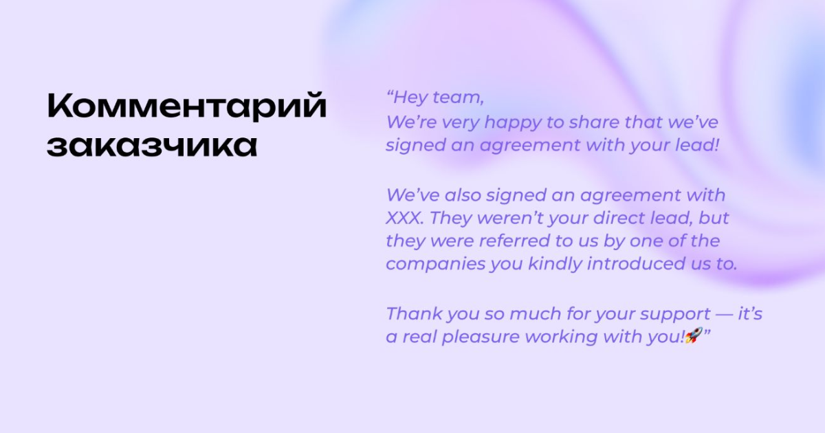За встречами последовал коммерческий результат: одна прямая сделка и одна реферальная. Оценка клиента — 9/10 по общему результату и 10/10 по готовности рекомендовать.