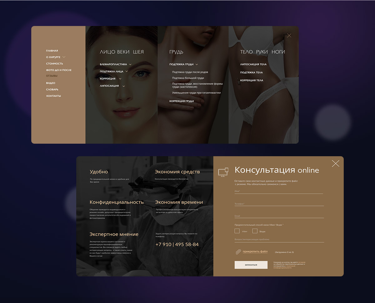 Для того, чтобы пользователю было удобно при выборе операций, мы сделали многоуровневое меню, разделённое на три основных раздела. Это лицо, тело и грудь. Также подробная форма обратной связи делает заказ конкретных услуг более удобным.