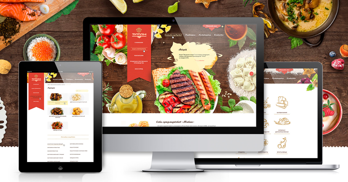 Разработать сайт для сети магазинов «Титан», где будет реализован заказ блюд, доступен каталог продукции. Создать ресурс с «вкусной» атмосферой, соответствующей деятельности компании.
