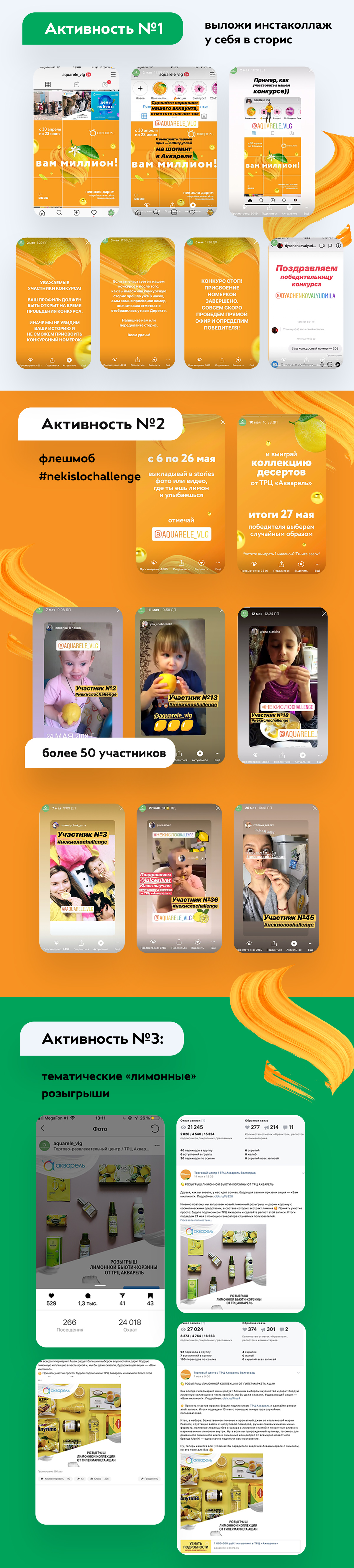 В результате 50 человек записали видео или сняли фото, как они весело едят лимон, выложили у себя в сторис и отметили Акварель. Все эти материалы менеджер агентства «Лайка» дублировал в сторис ТРЦ Акварель.