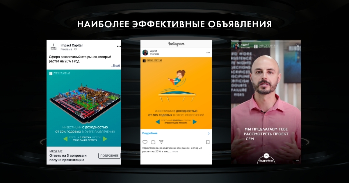 На основе статистики первых двух вебинаров у нас уже были представления об аудитории. Нам оставалось лишь настроить пиксель на сайте, подготовить рекламные объявления и тексты. Но перед запуском мы решили провести анализ конкурентов, список которых нам предоставил клиент. На удивление, через квиз в данной нише очень мало кто привлекает инвесторов, поэтому мы просмотрели объявления зарубежных компаний и преступили к созданию креативов.