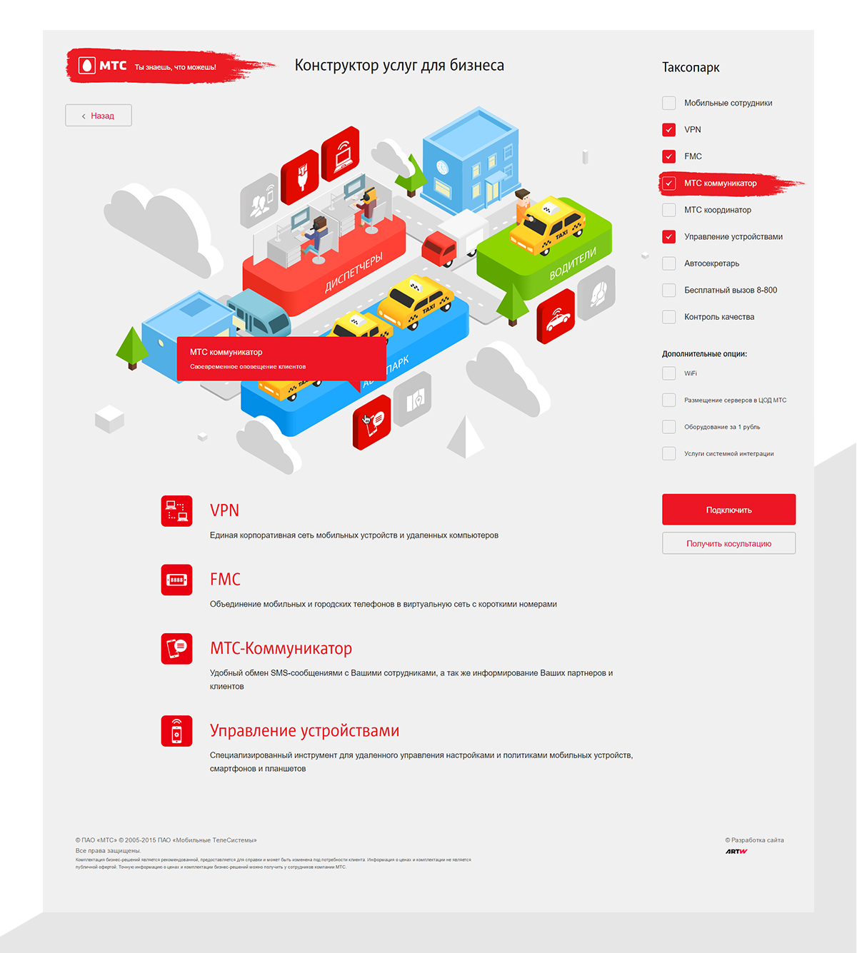 Интерактивный конструктор услуг b2b-направления компании МТС: решения для таксомоторных, логистических, строительных и охранных компаний.