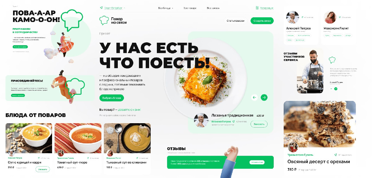 Мы сделали упор на блюда, добавили вывод подборок на главной, чтобы пользователи с первого экрана понимали, что это за сервис. А информацию для поваров вынесли на отдельный лендинг. Фишка выбранного дизайна — использование клейморфизма, одного из трендов 2022 года в вебе. Это направление использует трехмерные объекты: округлые, объемные и сглаженно-пышные на вид. Клейморфизм в проекте всюду: и на главной, и на странице для изготовителей, и даже на 404 странице.