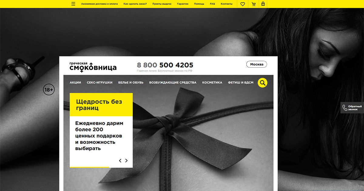 Сегодняшний кейс — магазина товаров для взрослых «Греческая смоковница». Так что, дорогой читатель, если тебе нет 18, выруби компьютер и занимайся своими невинными детскими делами. А тем, кто на работе, рекомендуем смотреть сайт осторожно :) Можно даже со смартфона — он адаптивный.