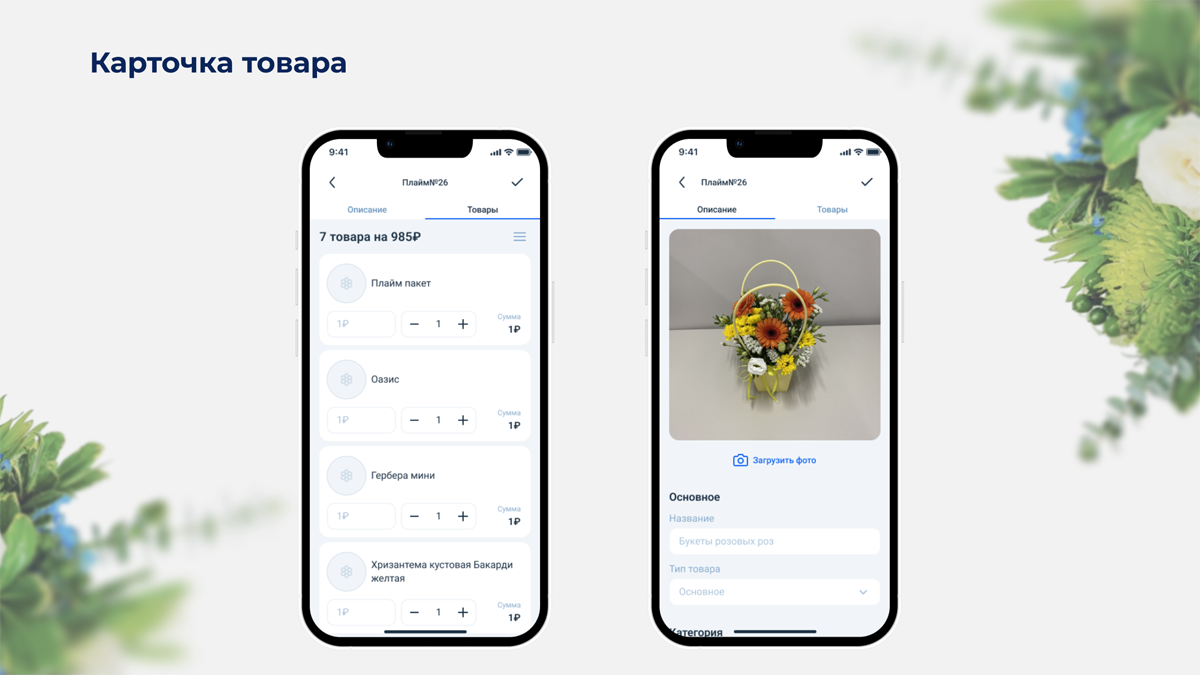 Перед нами стояла задача разработать кроссплатформенное мобильное приложение с функциями CRM/ERP-системы, представляющее из себя рабочее место продавца-флориста цветочного магазина. Мобильное приложение должно было сократить время на выполнение рутинных операций в работе флориста, таких как: