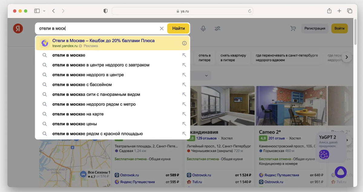 Тут мы столкнулись с проблемой: частотные запросы, вроде «Снять гостиницу в Питере» были заняты популярными сервисами бронирований, вроде «Островка» или «Яндекс.Travel». У них есть возможность вкладывать большие деньги в контекстную рекламу, а наш бюджет был ограничен.